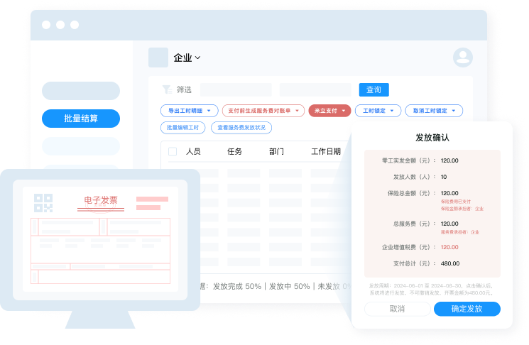 系统一体化, 数据互通零工身份透明即时,多种零工类型的实时自动化管理, 轻松管理复杂工种,支持多项目、多区域独立运营管理 -